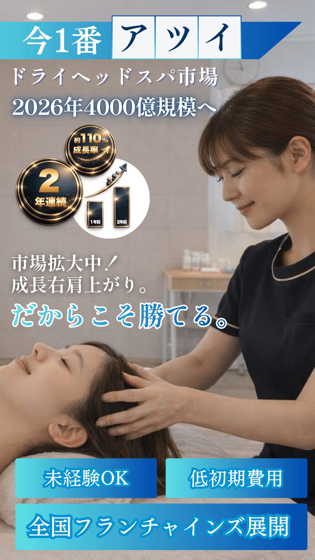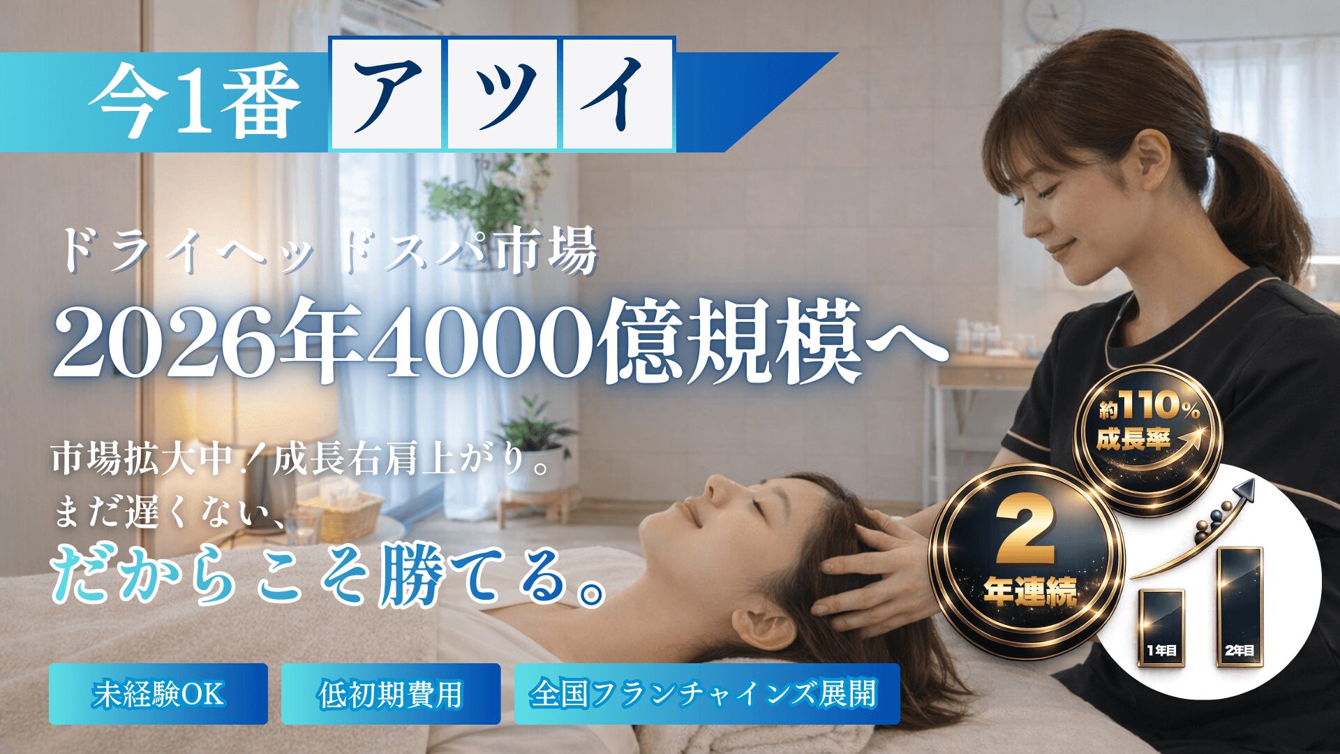 日本のリラクゼーション市場は急速な回復と成長を続けています。 特にドライヘッドスパは、スマホ社会の眼精疲労、深刻な「睡眠不足」を解決するインフラとして、今、最も注目されているカテゴリーです。