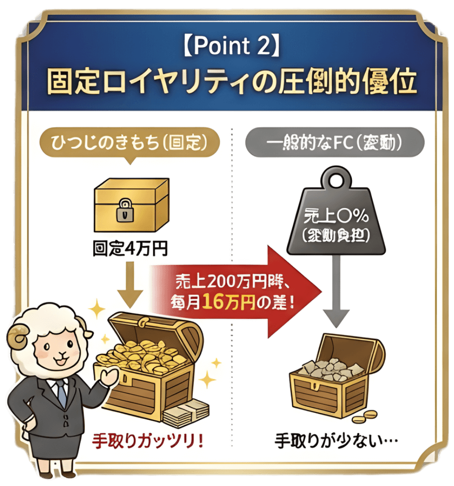 多くのFCは売上に比例してロイヤリティが増える構造ですが、それでは本当のパートナーとは言えません。